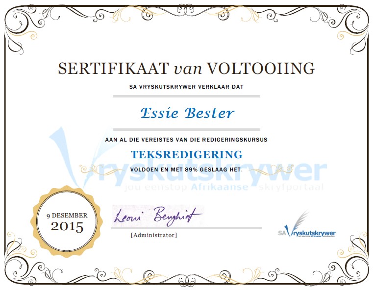 Ek besluit in 2015 om my passie uit te leef en met woorde te werk en speel. Ek voltooi 'n kursus in Teksredigering en Proeflees deur SA Vryskutskrywer in Desember 2015.