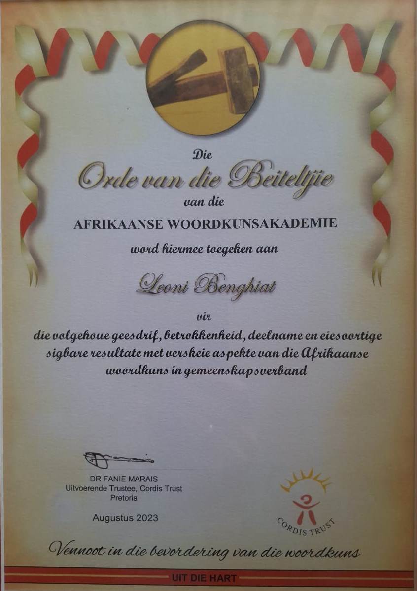 • Augustus: SA Vryskutskrywer se stigter, Leoni Benghiat, ontvang Die Orde van die Beiteltjie van die Afrikaanse Woordkunsakademie. Dié toekenning word sedert 2015 deur die Cordis Trust aan ontvangers toegeken wat die Afrikaanse taal deur skeppende werk bevorder.