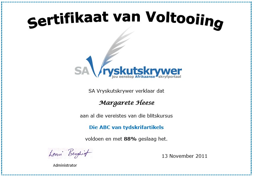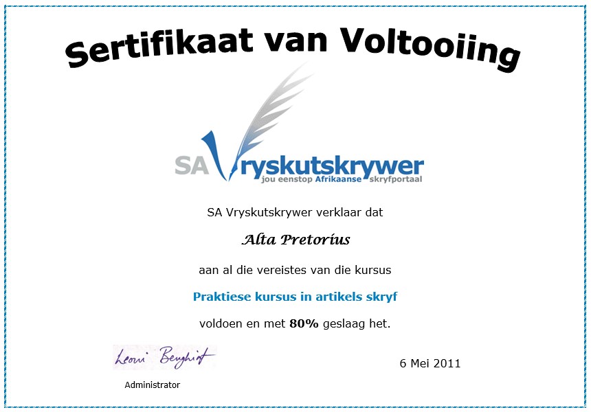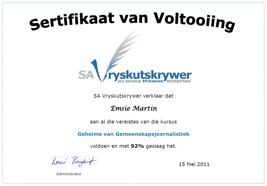 • Indien jou sertifikaat nie hier is nie, stuur dit asseblief aan ons.