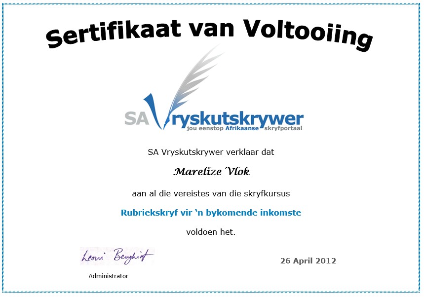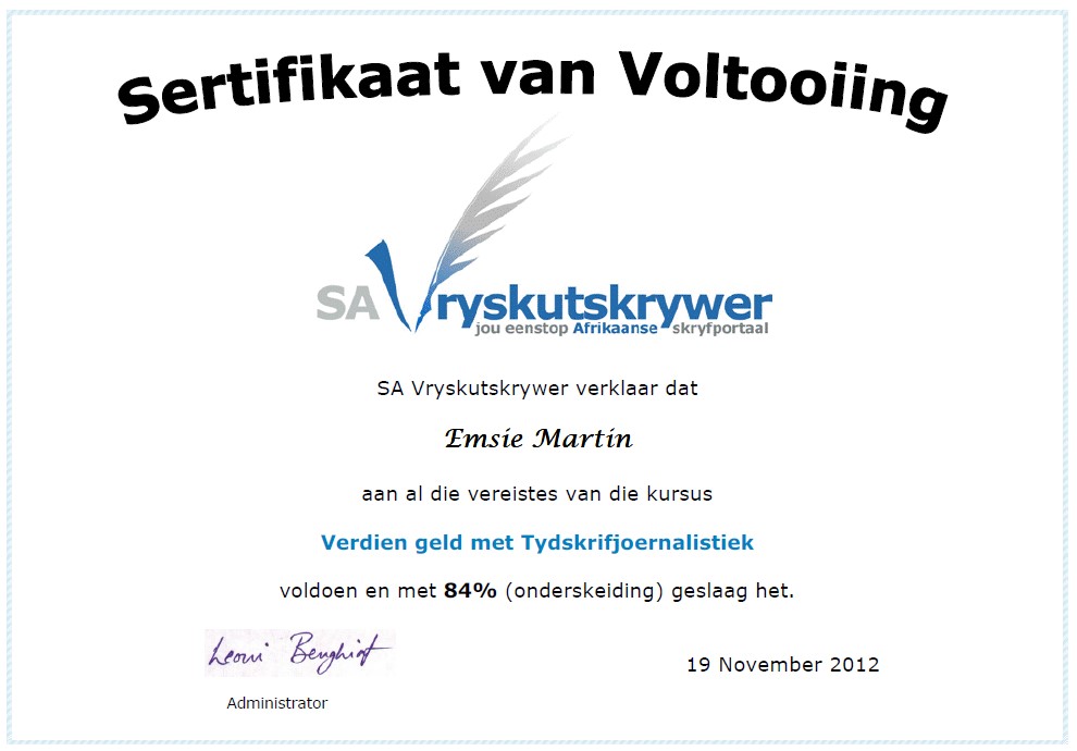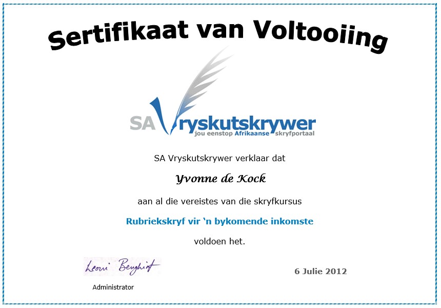 Indien jou sertifikaat nie hier is nie, stuur dit asseblief aan ons.