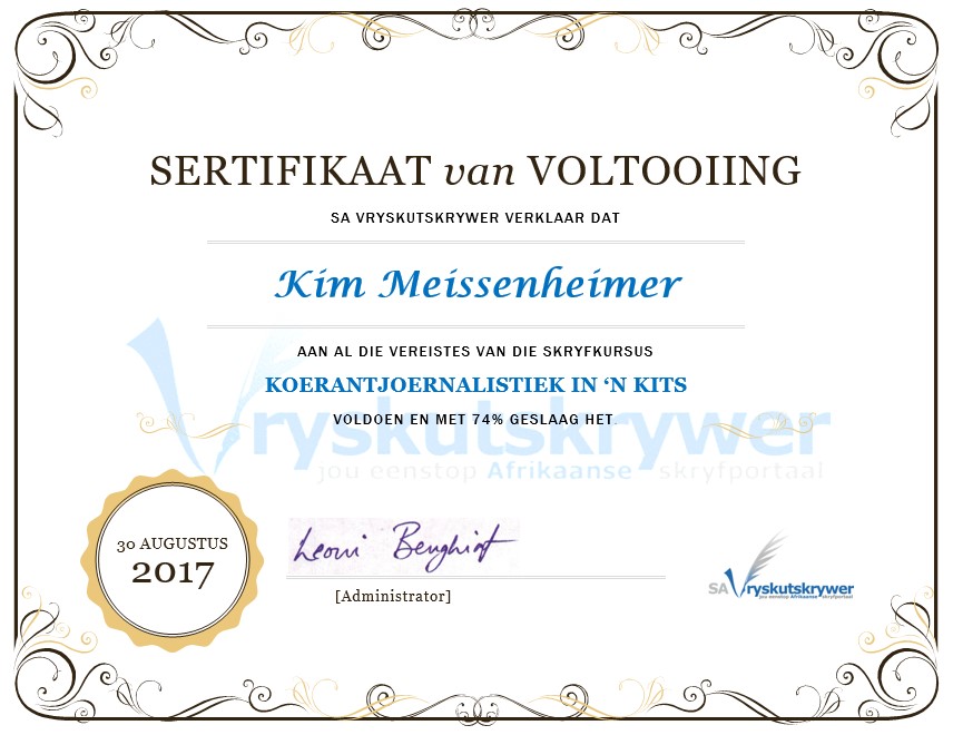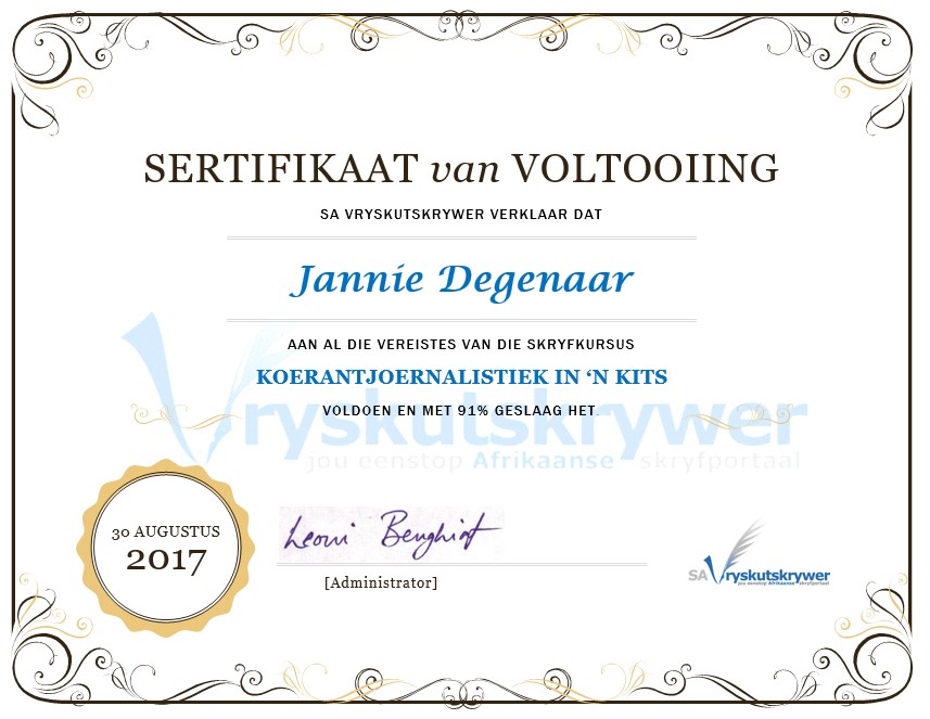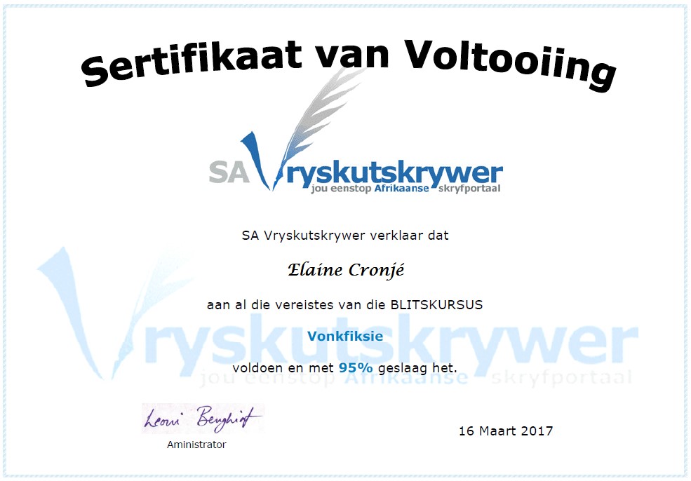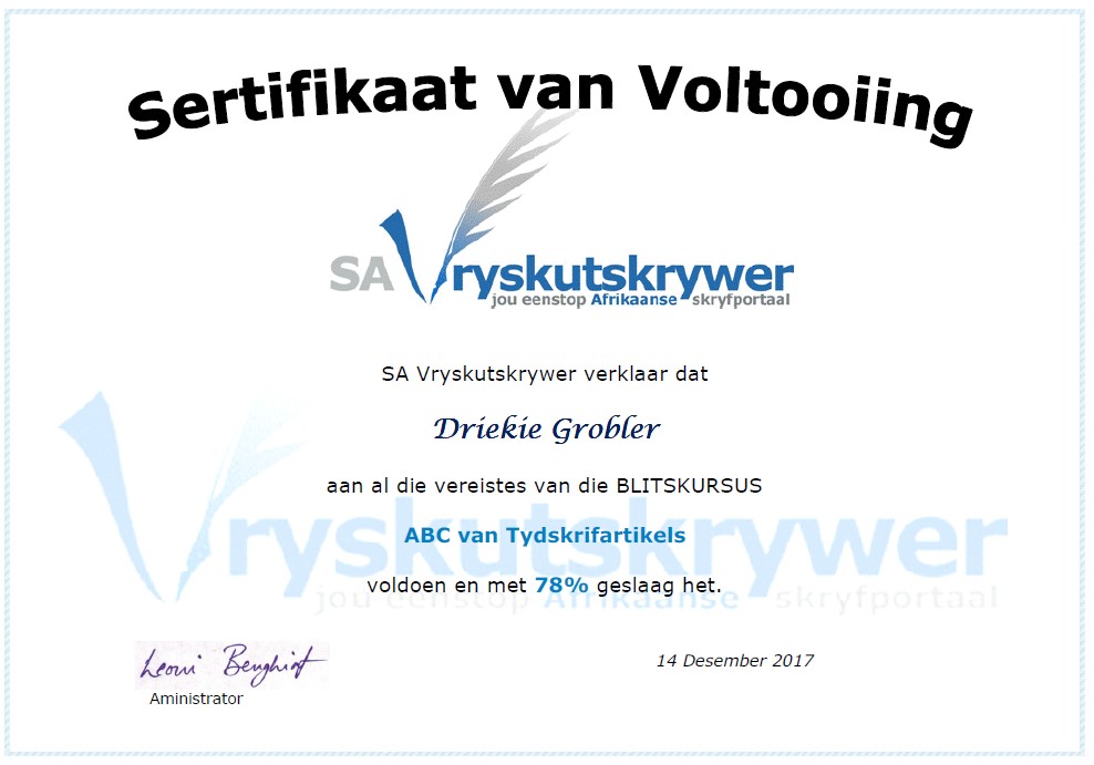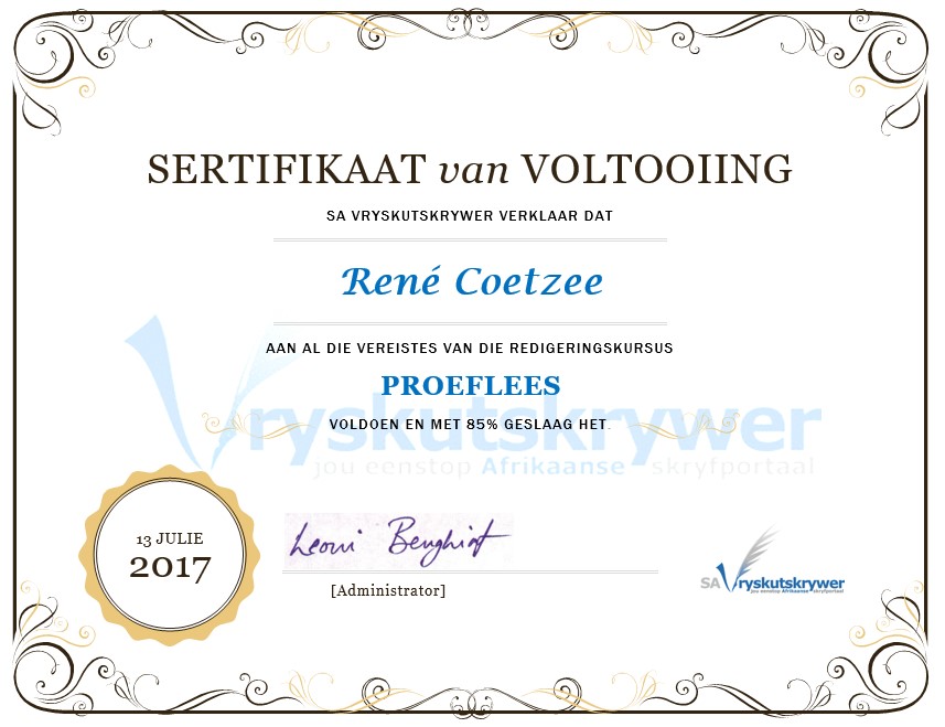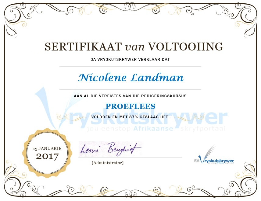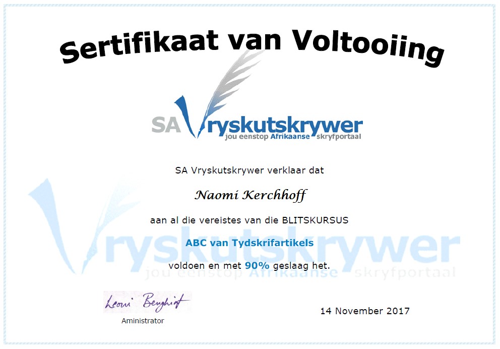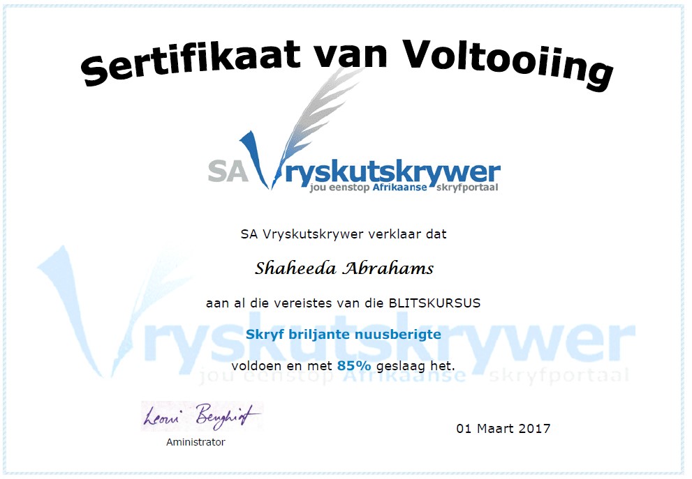 Indien jou sertifikaat nie hier is nie, klik asseblief hier om dit aan ons te stuur.