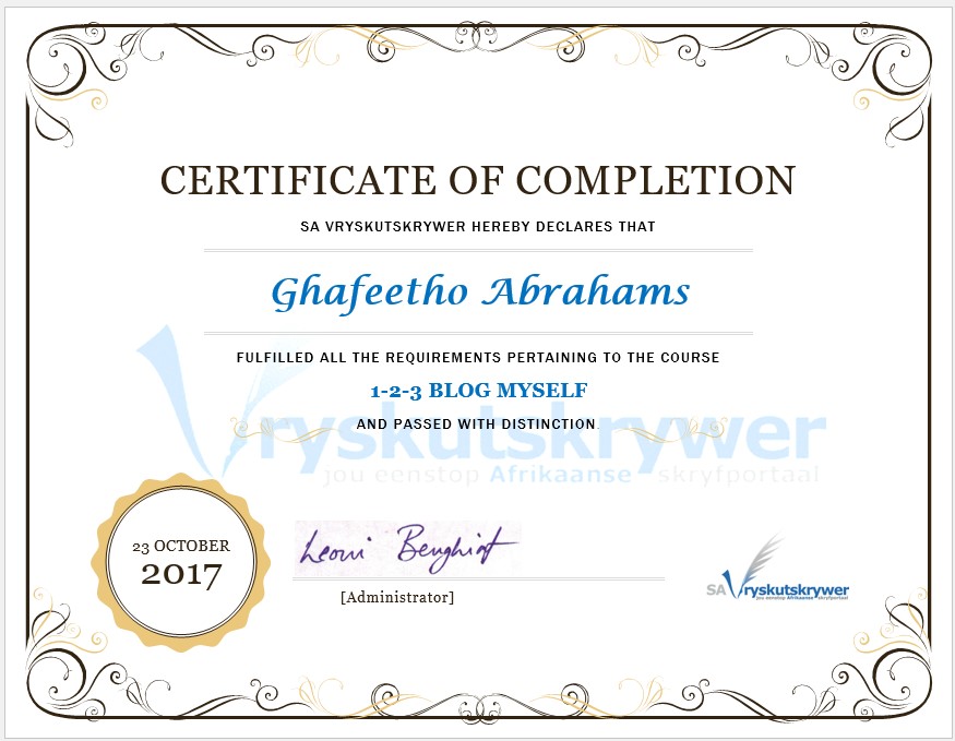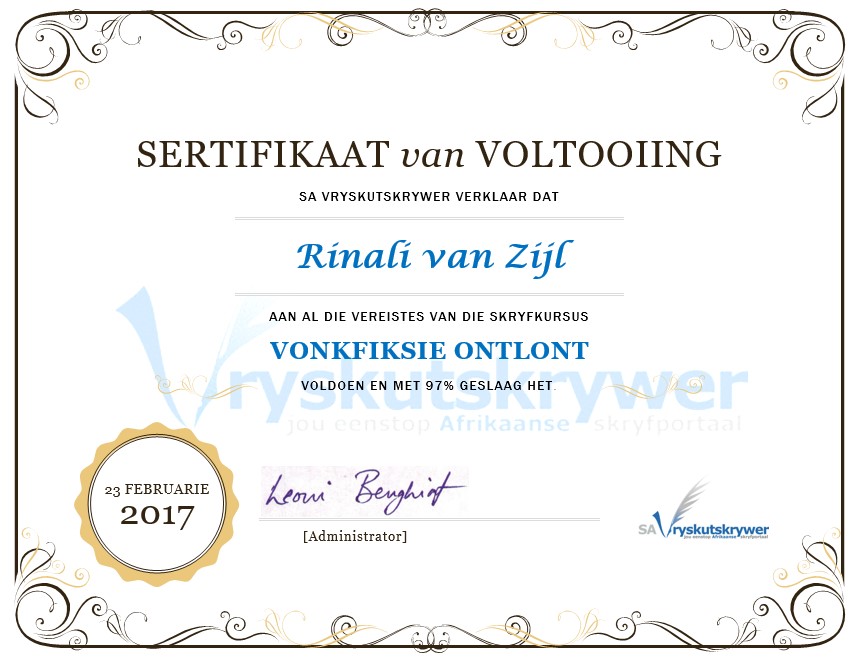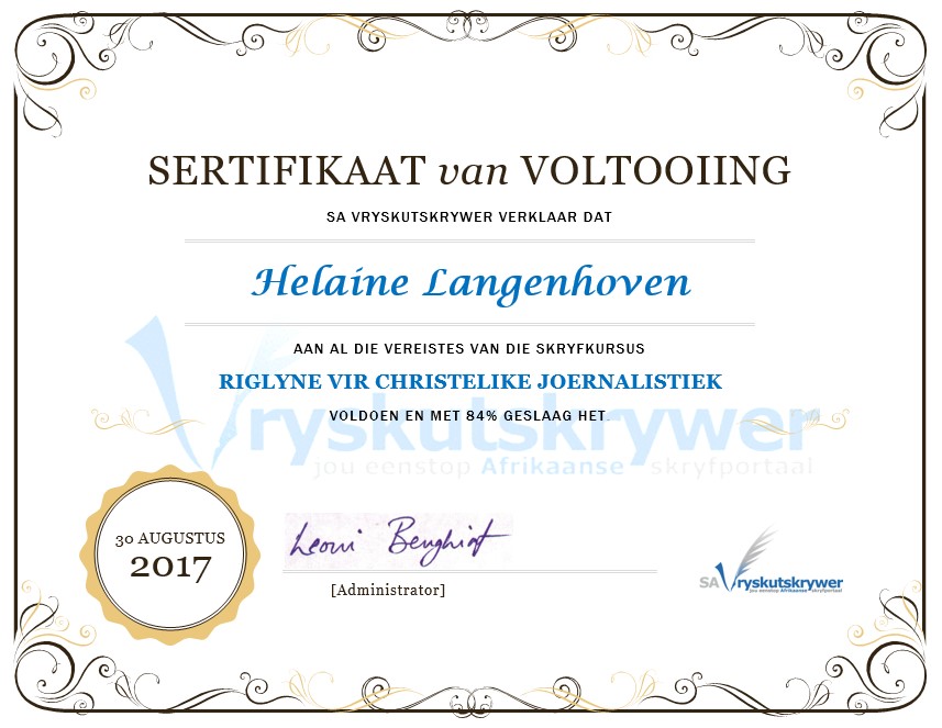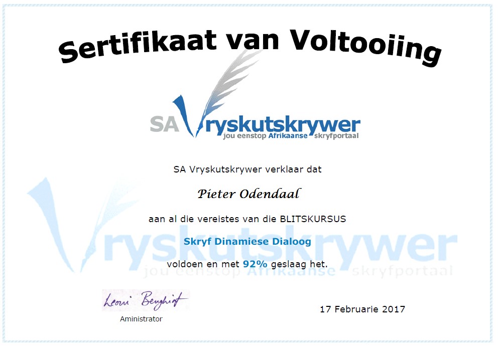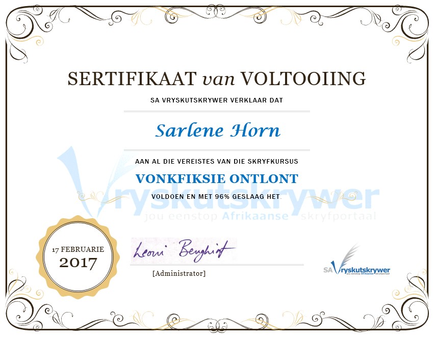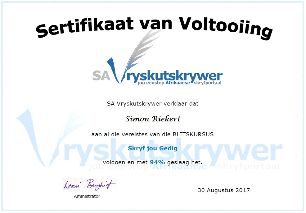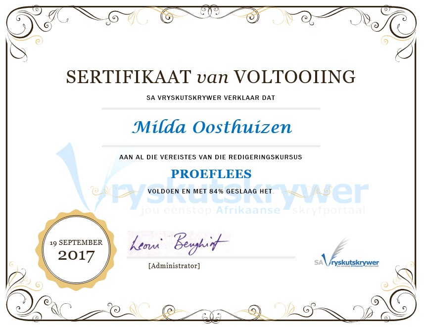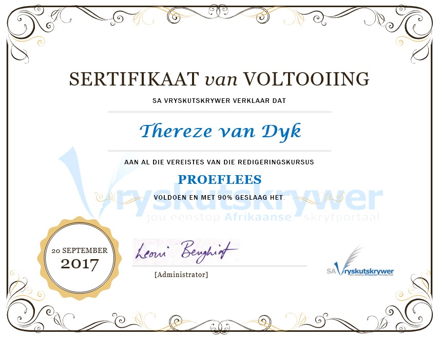 Indien jou sertifikaat nie hier is nie, klik asseblief hier om dit aan ons te stuur.