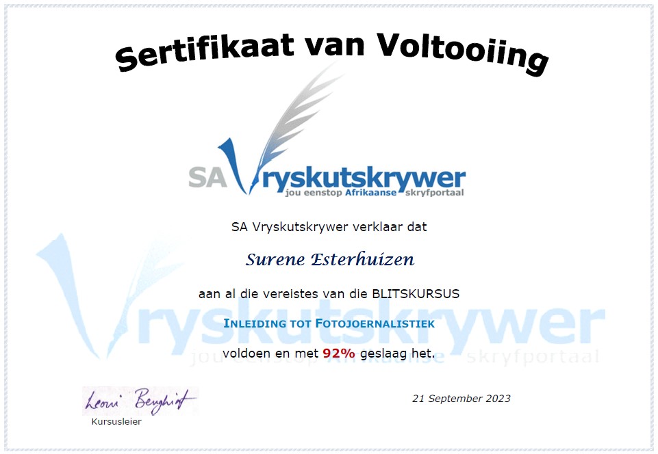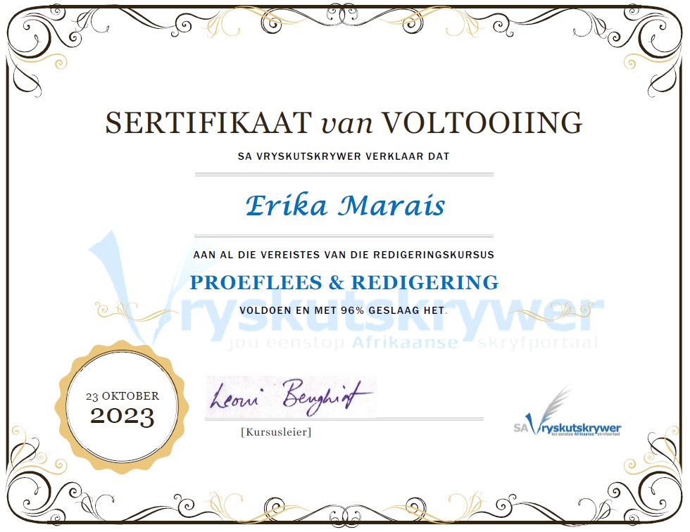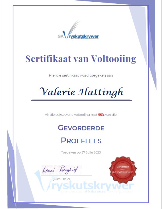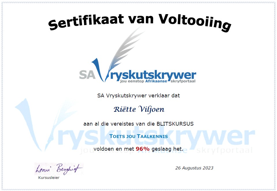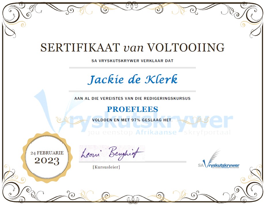 Indien jou sertifikaat nie hier is nie, klik asseblief hier om dit aan ons te stuur.
