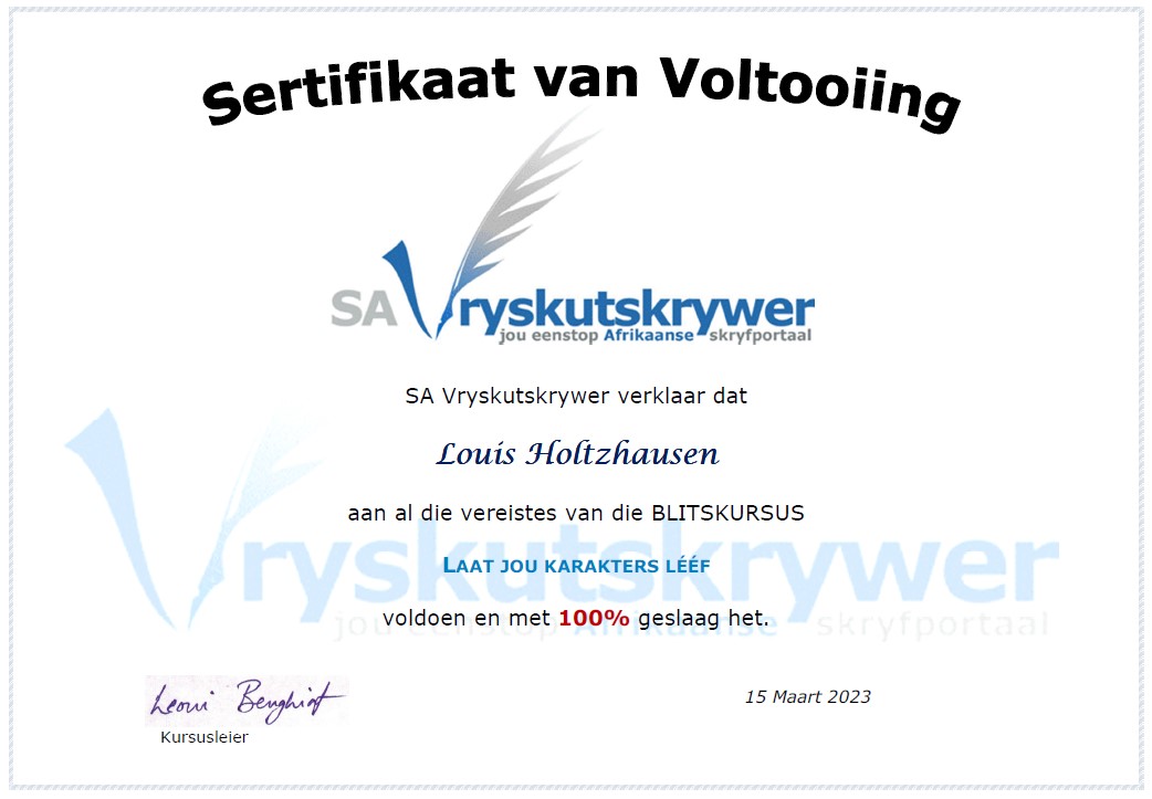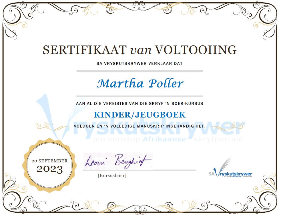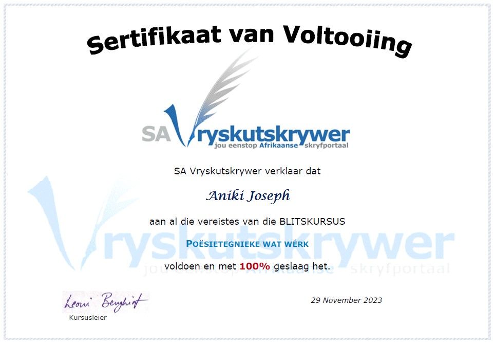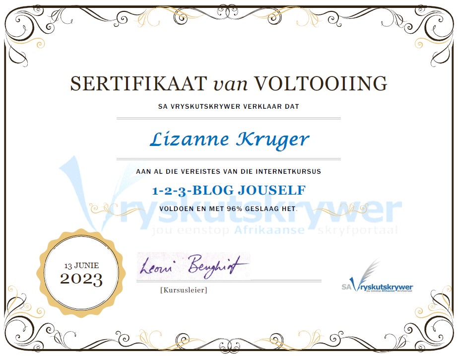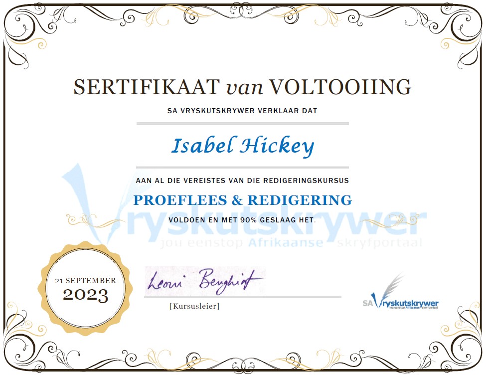 Indien jou sertifikaat nie hier is nie, klik asseblief hier om dit aan ons te stuur.