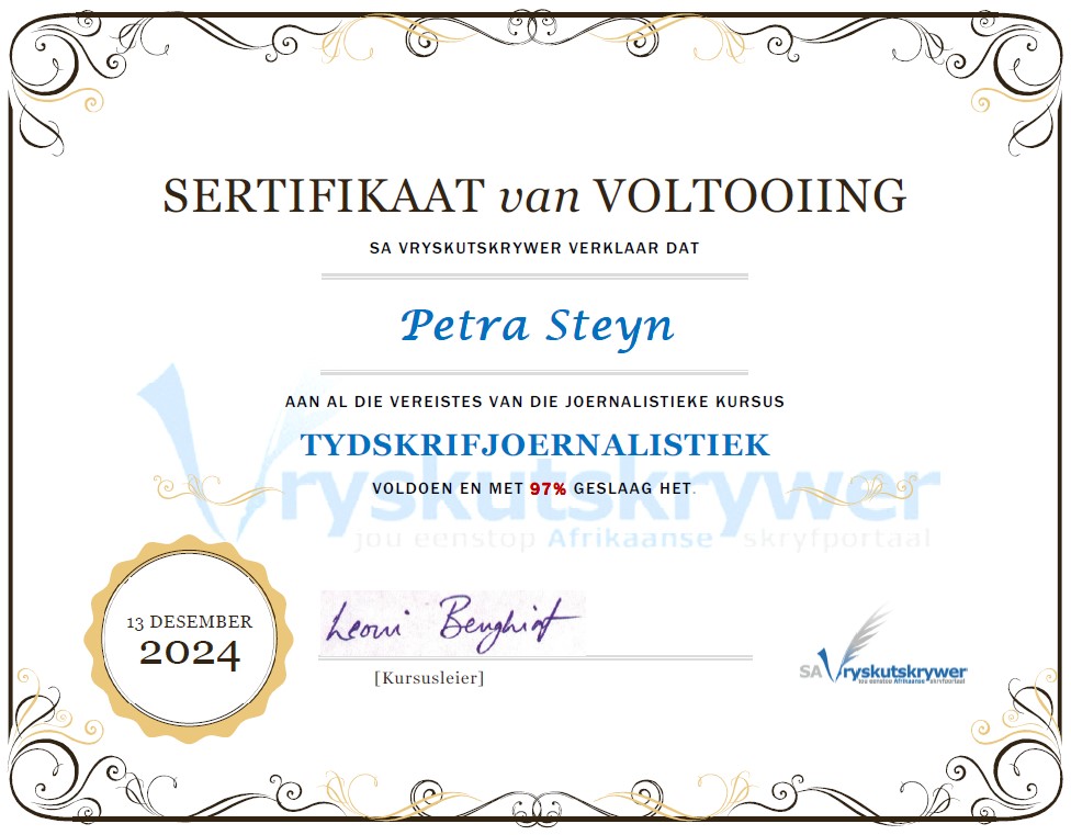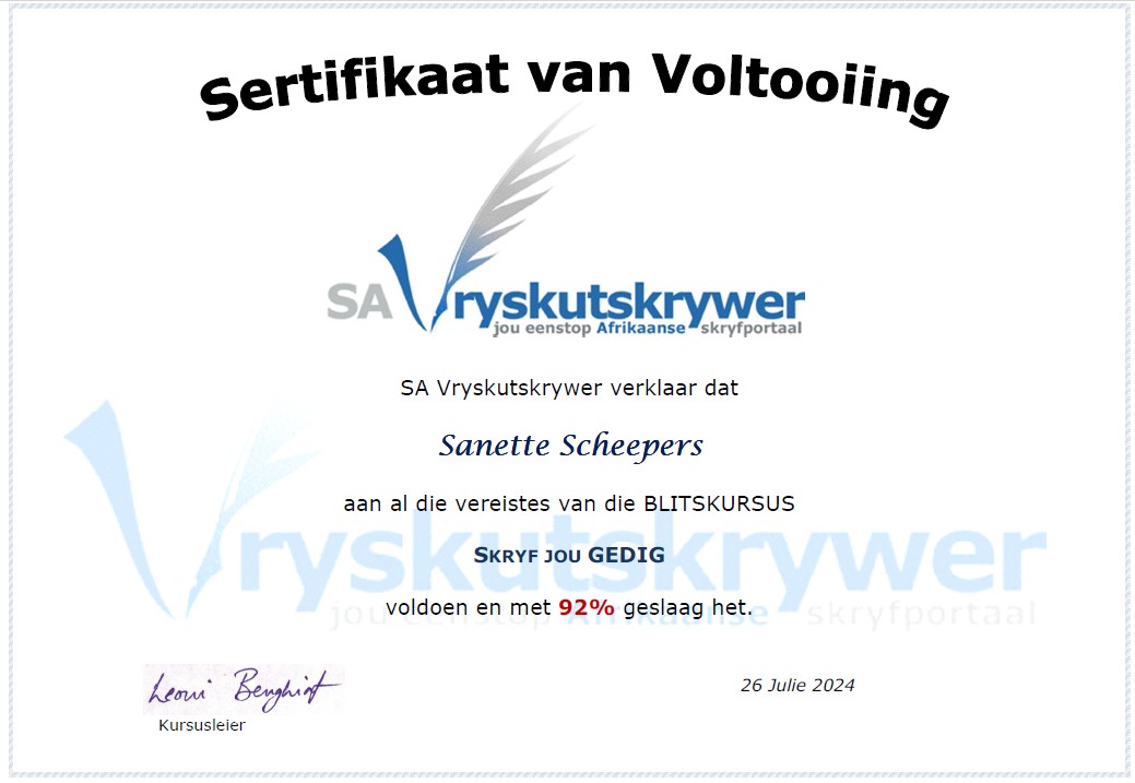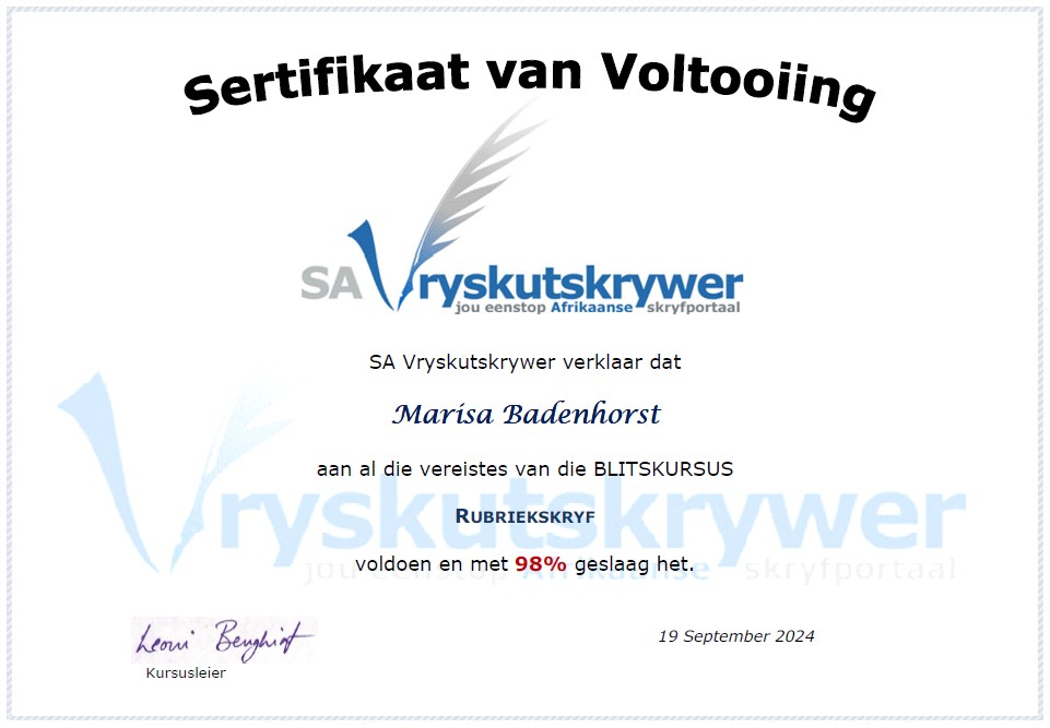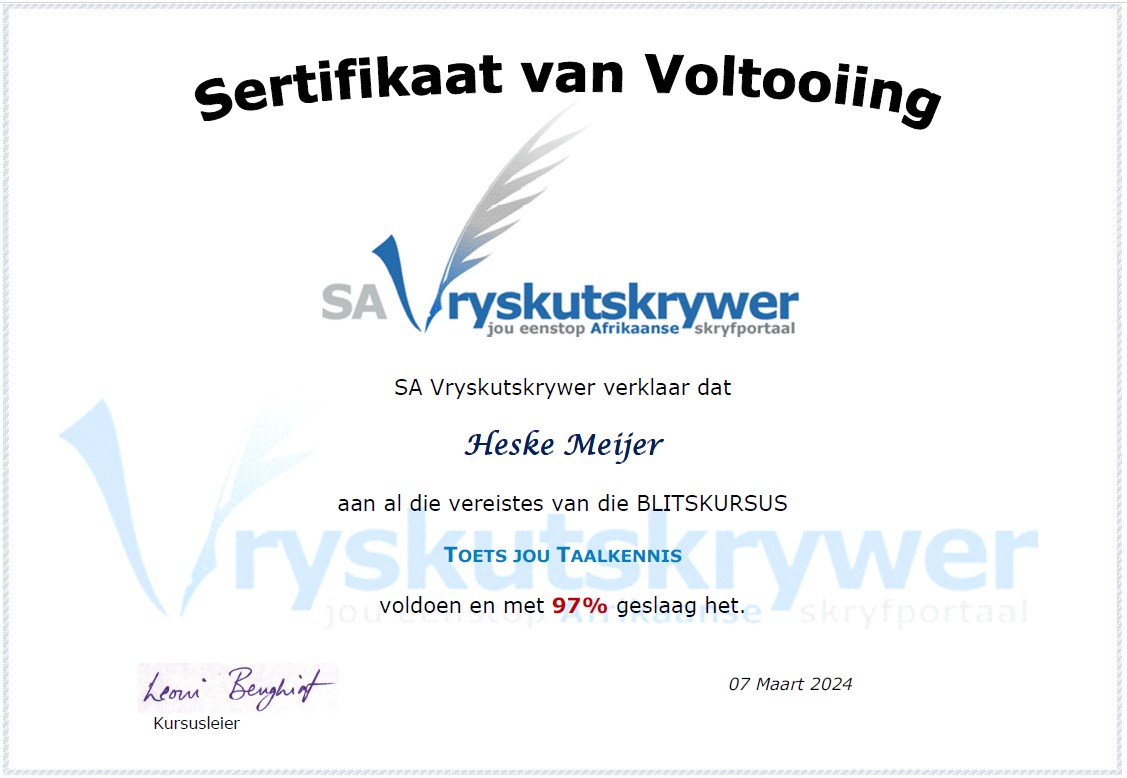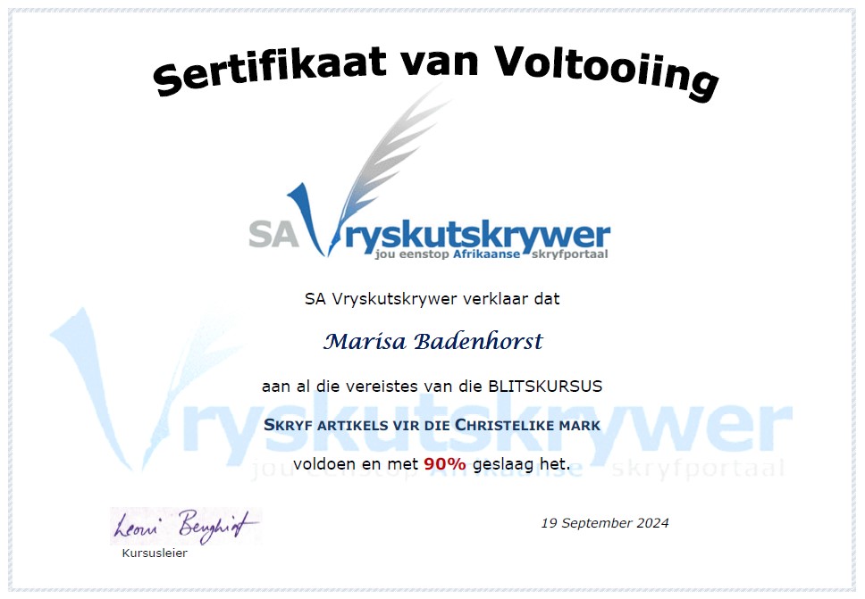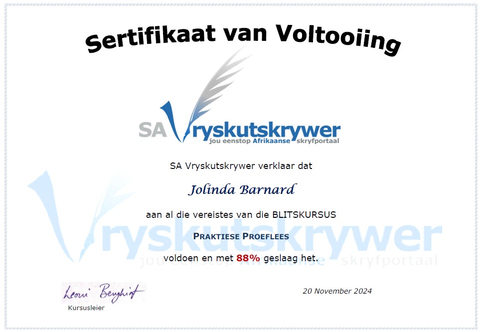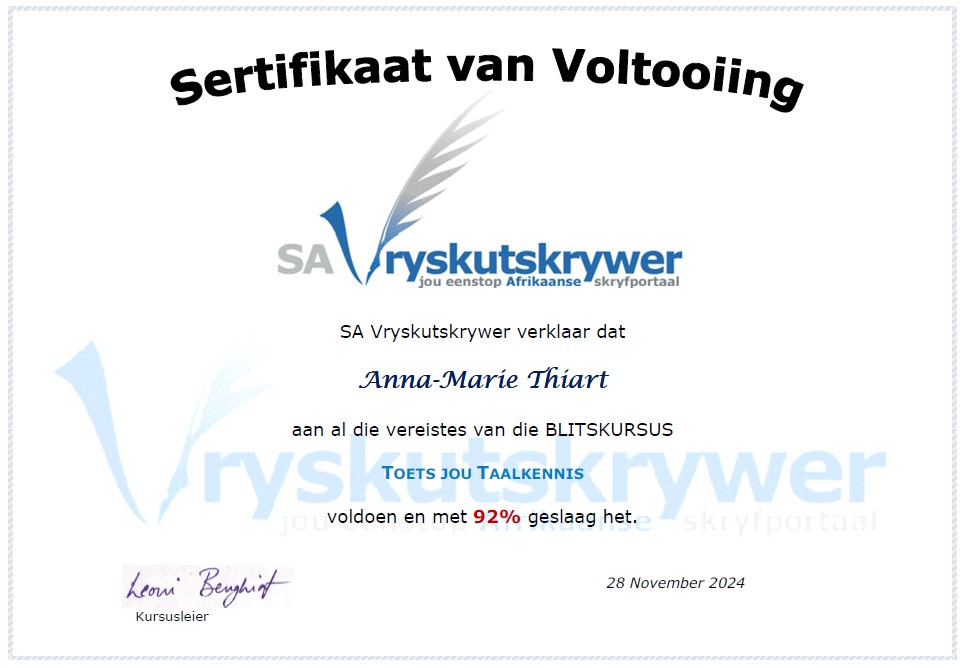 • Indien jou sertifikaat nie hier is nie, klik asseblief hier om dit aan ons te stuur.