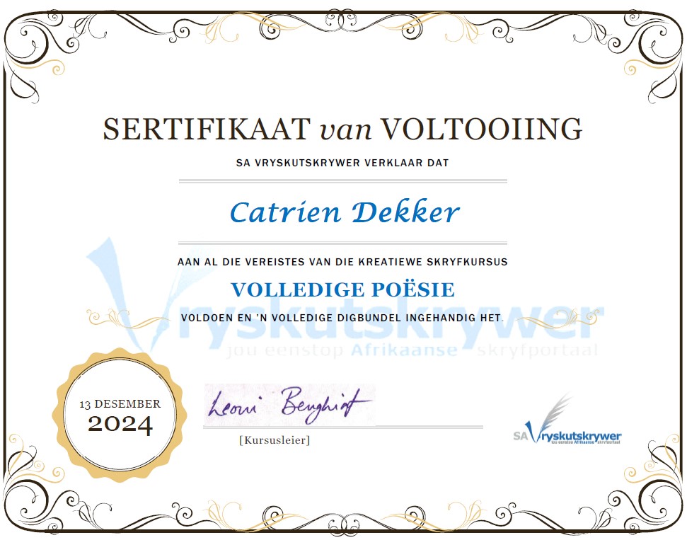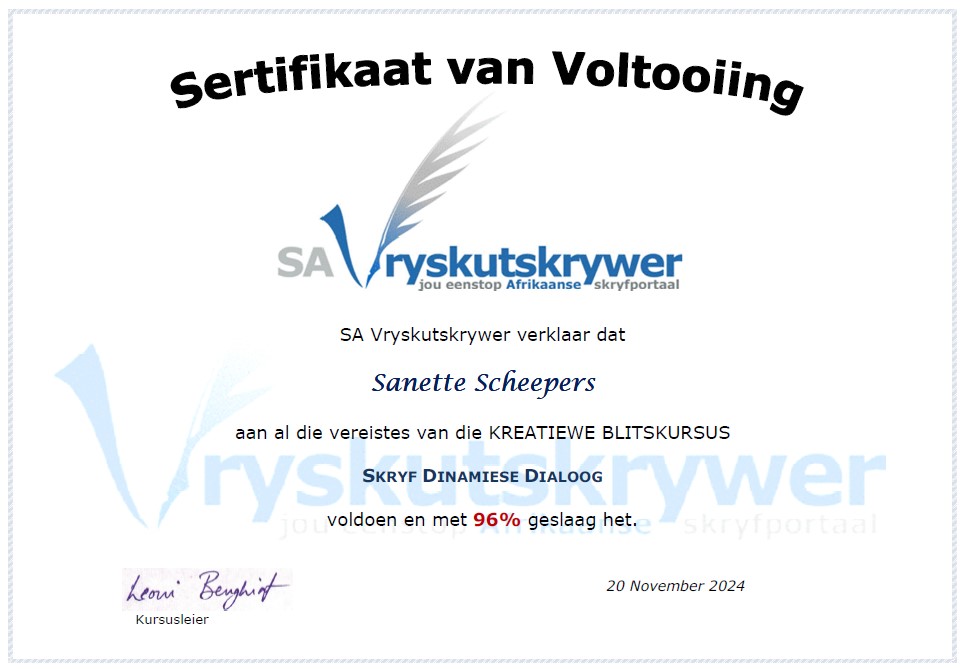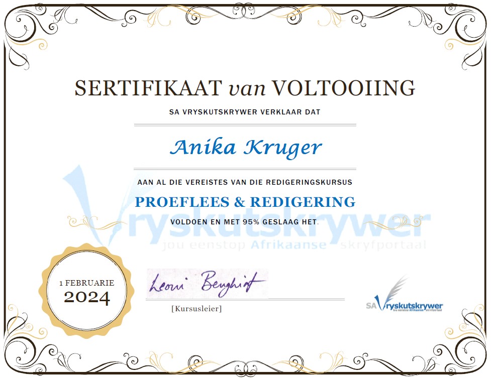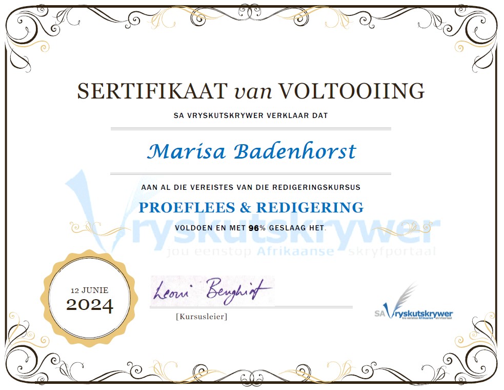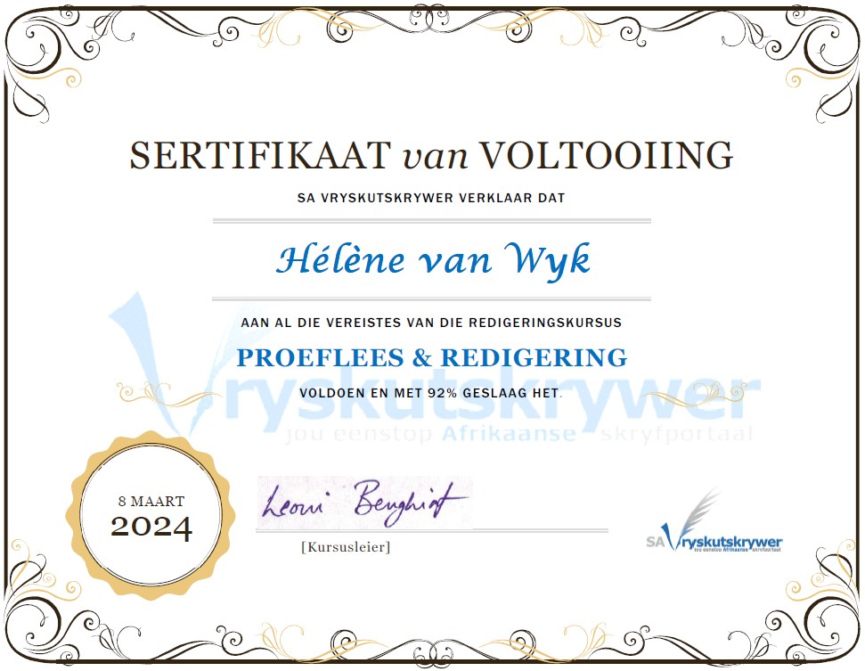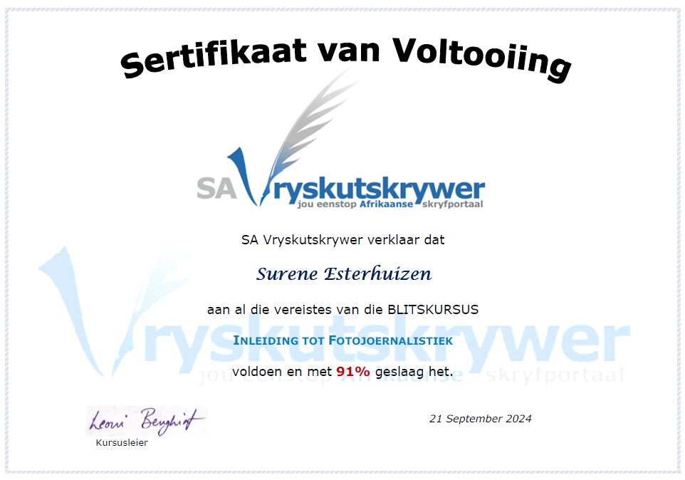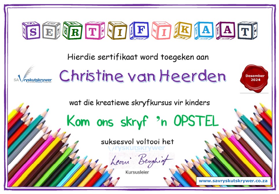 • Indien jou sertifikaat nie hier is nie, klik asseblief hier om dit aan ons te stuur.