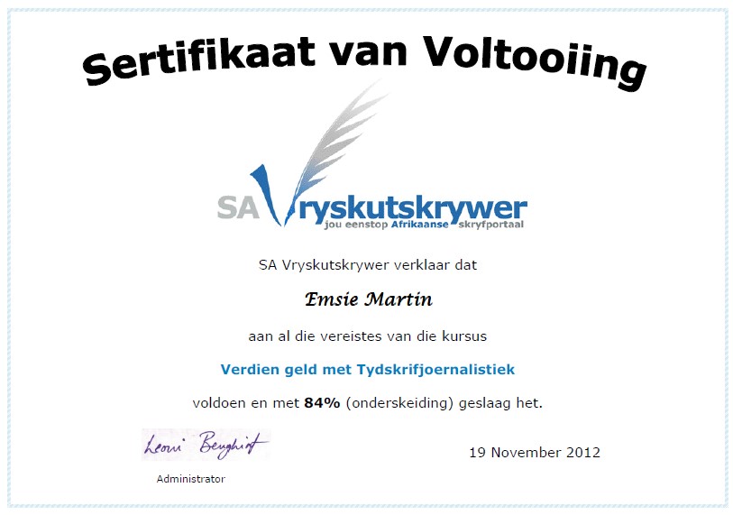 • Skryf rubriek en artikels vir koerant sedert 2004.