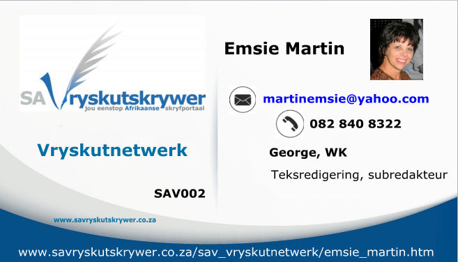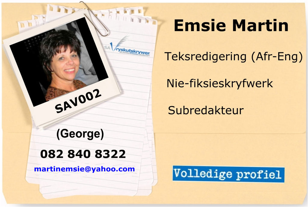Taalversorging, artikels skryf, niefiksie-skryfwerk, selfhelpboeke, geskiedenisboeke, navorsing, rubrieke, koerantberigteBeroep: